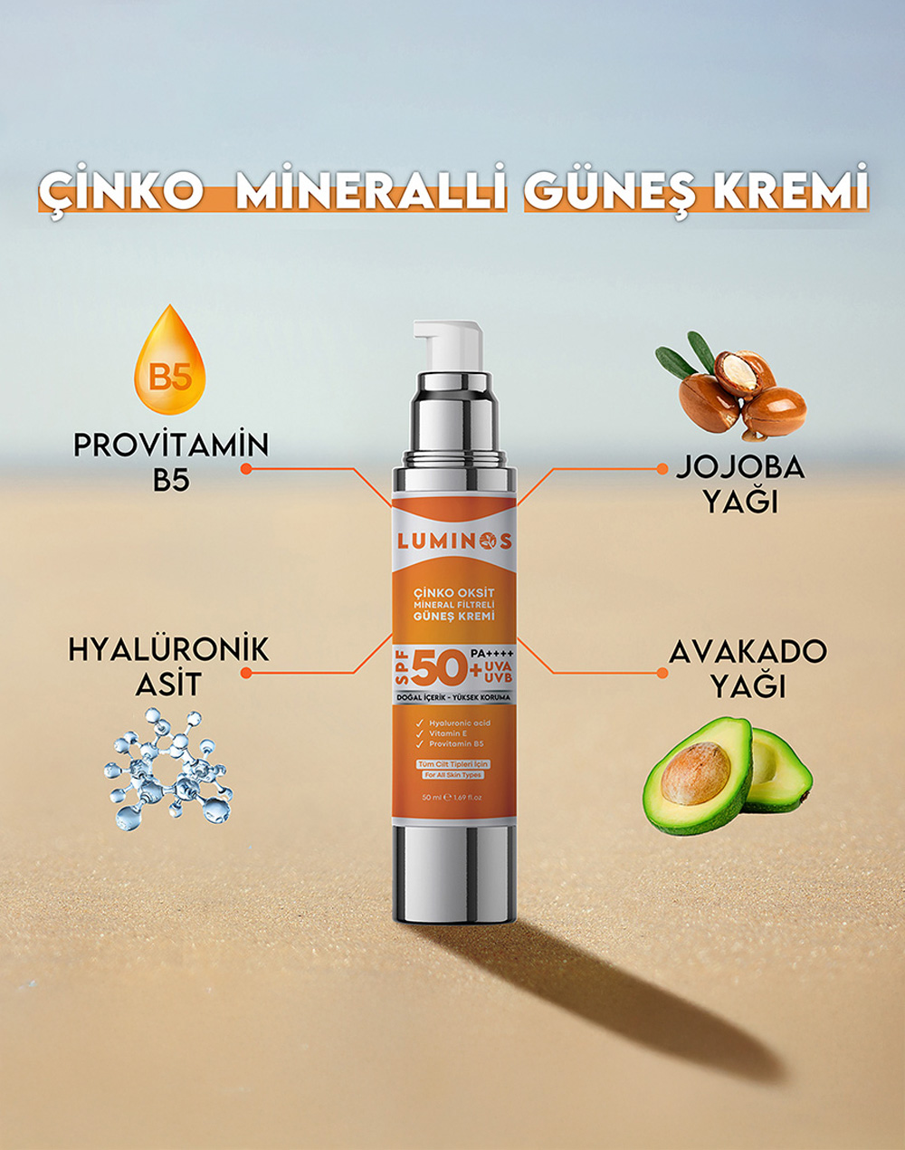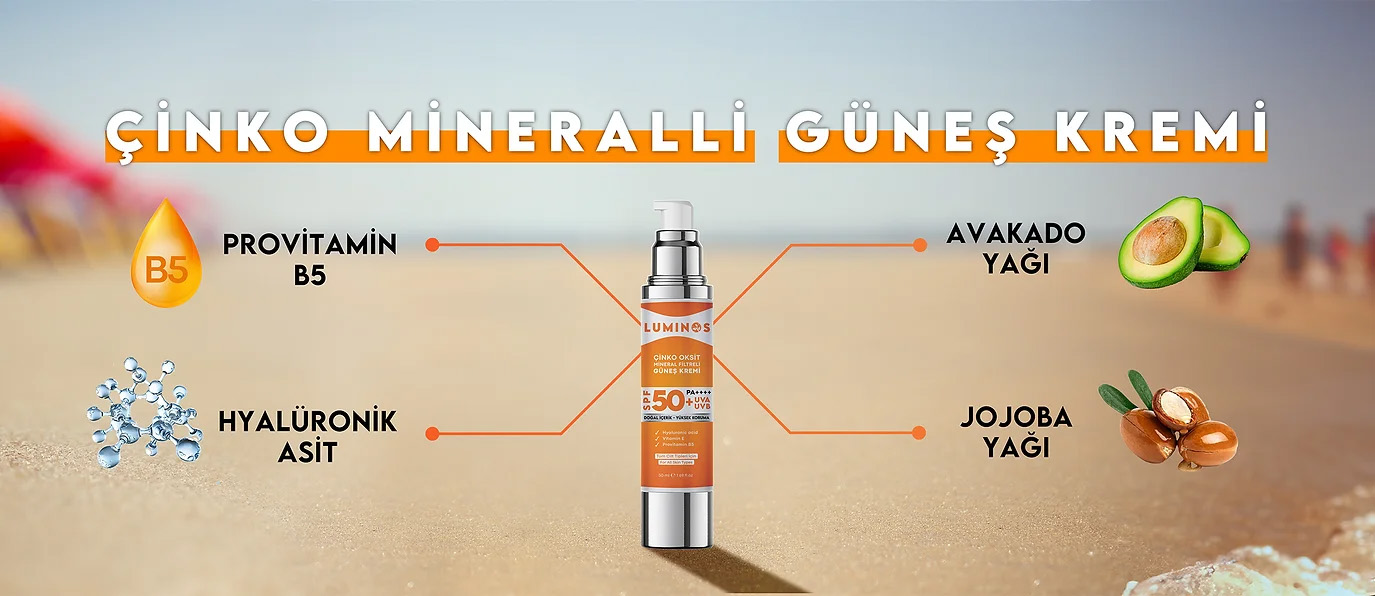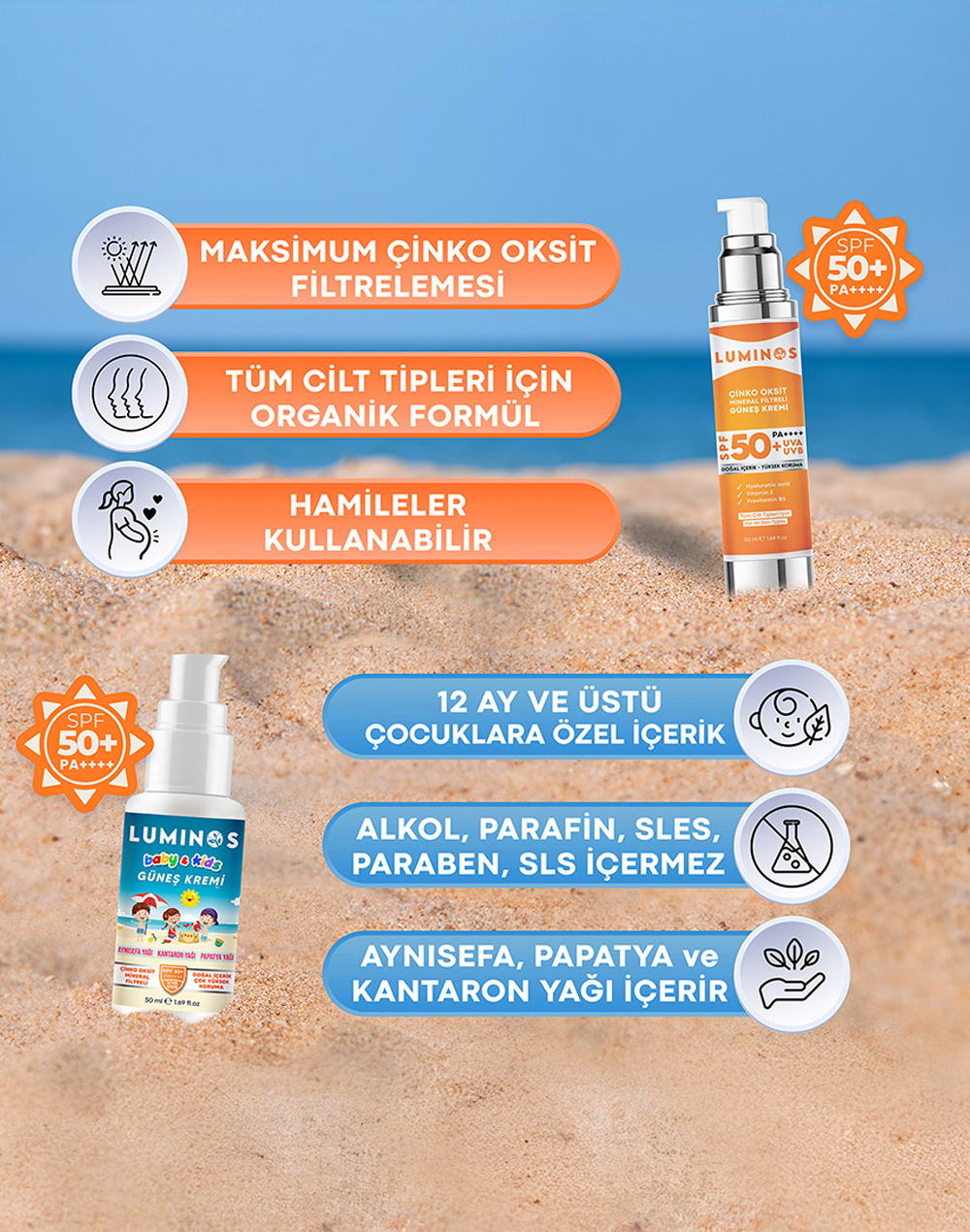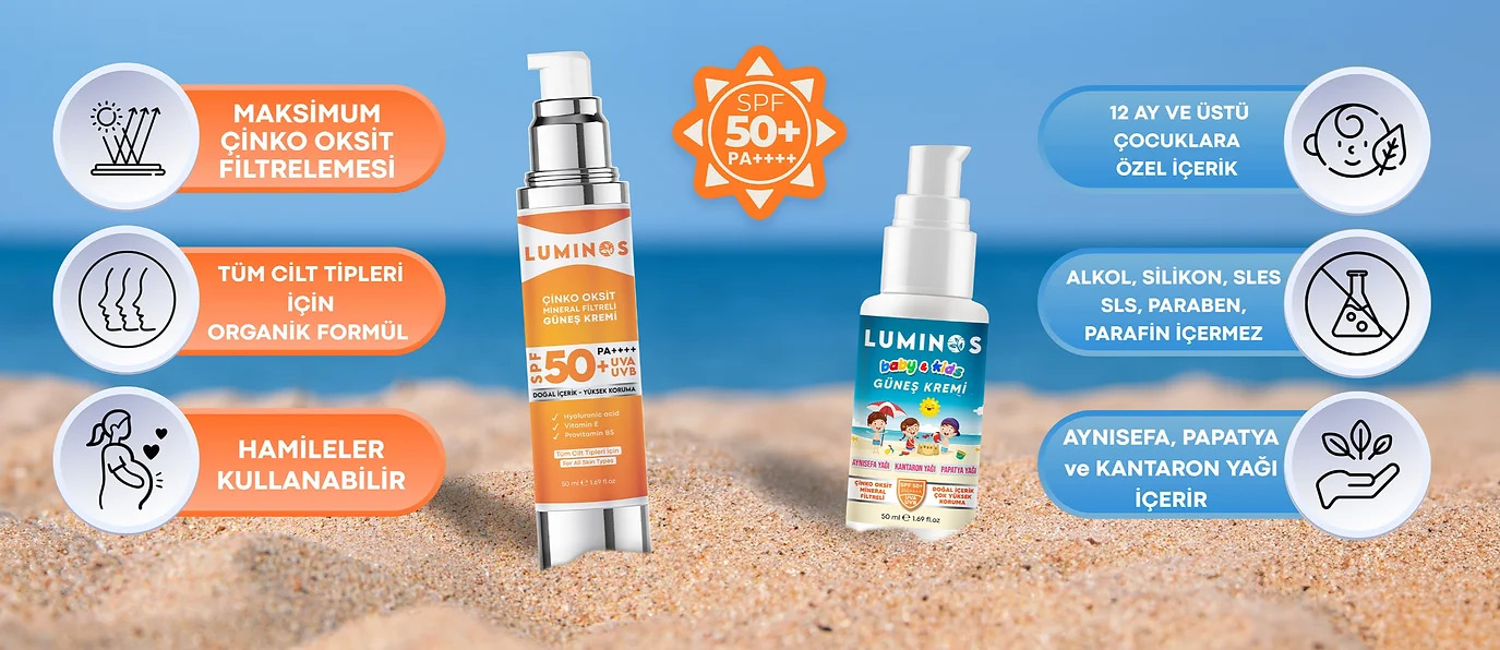 Doğal çinko oksit mineral filtreli LUMİNOS ORGANİK GÜNEŞ KREMİ, güneşten korunmak için etkili ve doğal bir üründür.
