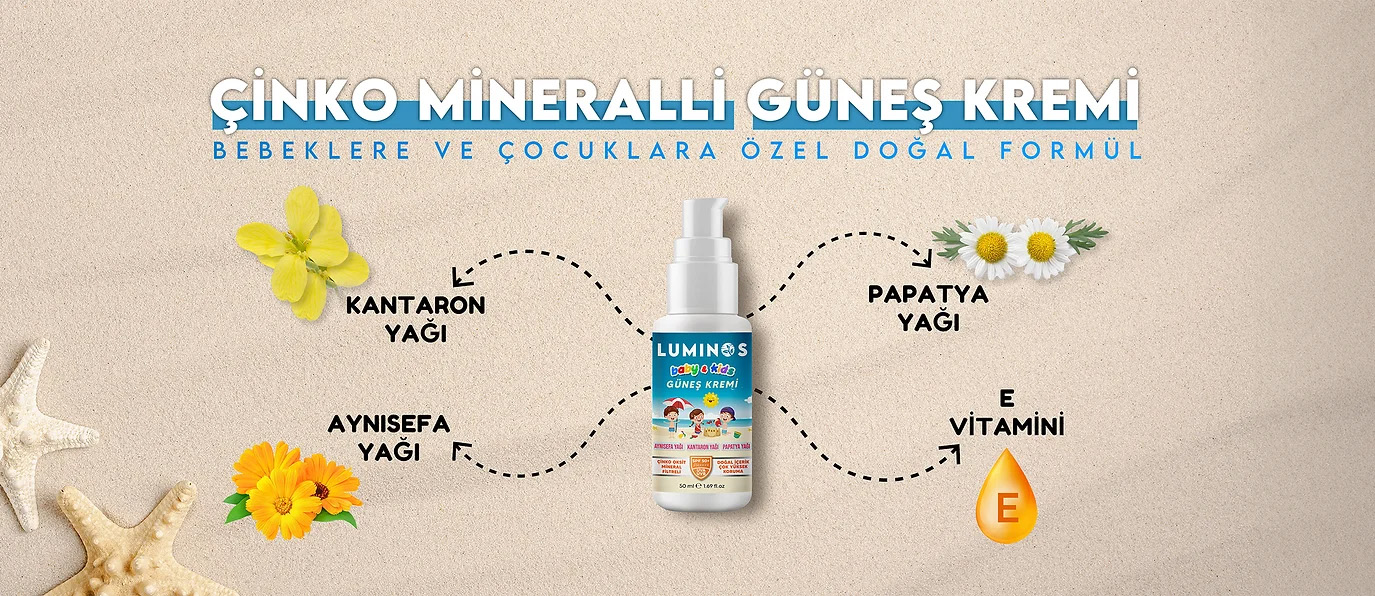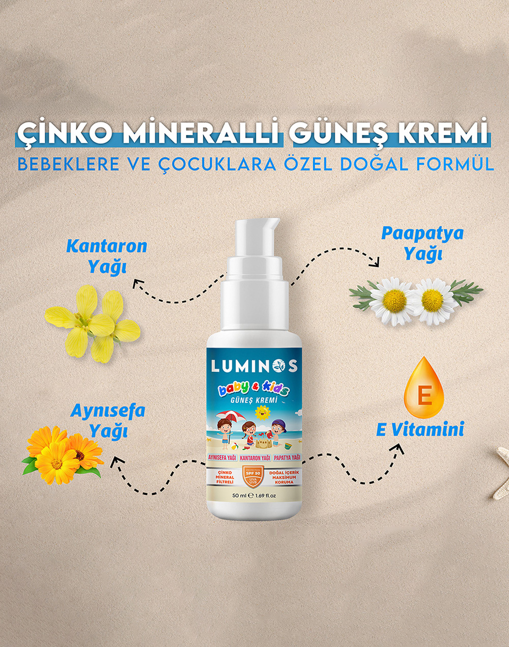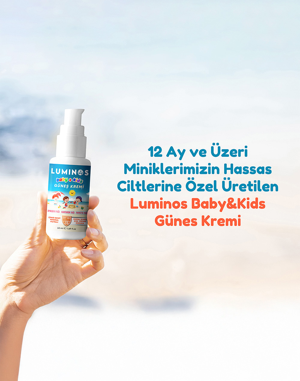 Doğal çinko oksit mineral filtreli LUMİNOS BEBEK VE ÇOCUKLARA DOĞAL FORMÜL GÜNEŞ KREMİ, hassas minikler için en doğal ve ideal güneş kremidir.
